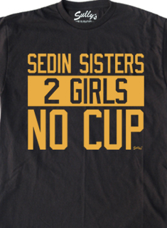 The greatest shirt ever: dude behind Vancouver bench rocking the “SEDIN SISTERS. 2 GIRLS, NO CUP”