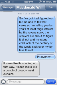 Really a shame. Typically a great match up, this one is derailed by injuries to Big Ben, Antonio Brown, and Rashard Mendenhall (who, in my opinion, may be done altogether). Flacco poured it on the Raiders last week, but he has been inconsistent and could choke whenever. If the Steelers were healthy they would win.